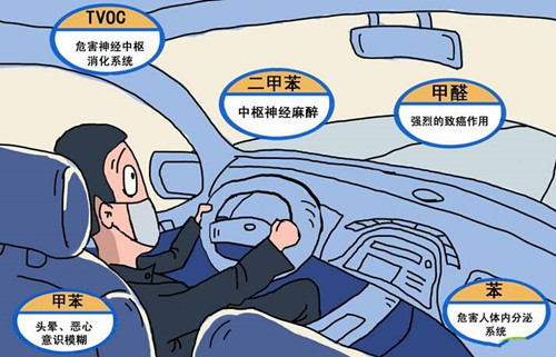 中国室内装饰协会空气监测中心曾对200辆车进行检测,参照室内空气质量标准,测试中近90%的汽车都存在车内空气甲醛或苯含量超标问题。中国科学院所属中科理化环境分析研究中心的检测结果显示,车内空气中所含的可挥发性有机化合物比室内平均超标30%,菌落总数平均超标77.65%。而新车车内,有害气体浓度的挥发时间可持续6个月以上!